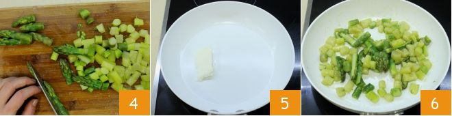 Once blanched, drain them and place them on a cutting board to cut into pieces 4. In a large pan, melt the butter 5 over very low heat and sauté the asparagus for a few moments 6: season with salt and pepper to taste.