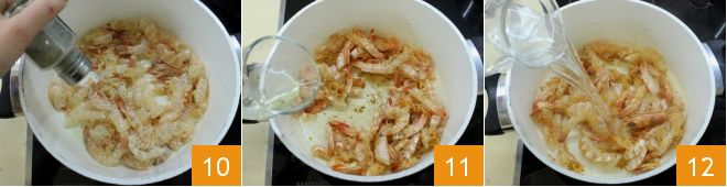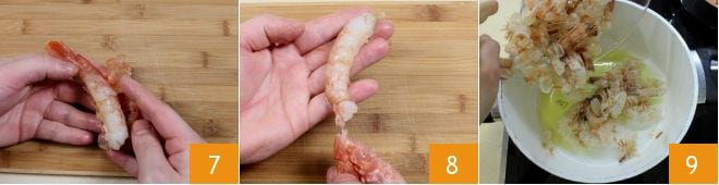 Continue the preparation by making the stock starting with How to clean shrimp. Remove the heads, legs, and shells 7 to gently extract the meat 8; do not discard the scraps as they will be used to make the Shellfish Stock: in a large pot, add a drizzle of oil, the peeled garlic clove, and the prawn heads and shells 9.