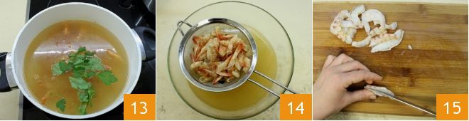 Add the fresh parsley 13, stir, and cook for about 20 minutes over medium heat, skimming the stock with a slotted spoon, making sure to rinse it every time to remove any residue. Once ready, pour it into a bowl, filtering the shells with a strainer 14, and set it aside as it will be used for the béchamel preparation. Now score the back of the prawns with a small knife 15 and remove the intestine, the black internal vein, gently pulling it out with a toothpick, trying not to break it. Then cut the prawns into pieces.