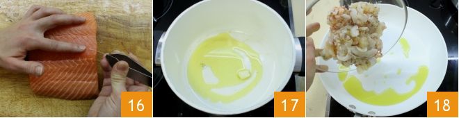 Take the salmon fillet, rub the surface with your hands to check for bones, and remove them with kitchen tweezers 16 if necessary. Then cut the salmon into cubes. At this point, in a wide pan, add a drizzle of oil and the peeled garlic clove 17, add the prawns 18, and sauté them.