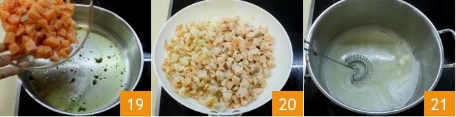 In another pan, add a drizzle of oil and chopped parsley, sauté for a few moments, then add the cubed salmon 19. Cook for a few moments over medium heat. When the salmon has turned pink on the outside, season with thyme and add it to the pan with the prawns 20, stir, and turn off the heat. Finally, focus on the béchamel: in a saucepan, add the butter and let it melt 21.