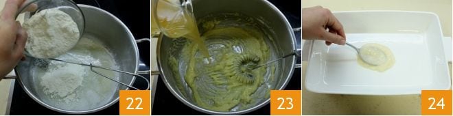 Then add the sifted flour slowly 22 and mix with a whisk. When you've created a smooth roux without lumps, slowly add 600 ml of shellfish stock 23 and mix. Cook for about 20 minutes or until a thick and smooth cream forms. Now that you have all the ingredients ready, you can assemble your salmon, prawn, and asparagus lasagna: take a 20x30 baking dish and spread a little béchamel on the bottom 24, spreading it with the back of a teaspoon over the entire surface of the dish.