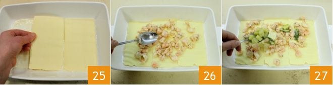 Then lay the thin sheets of egg pasta 25, add a layer of prawns and salmon 26, and one of asparagus 27.