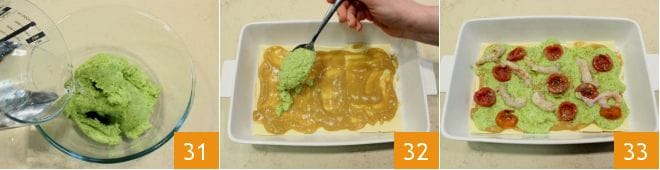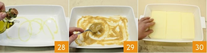Now that you have all the preparations, assemble the lasagna: grease a 12x8 inch baking dish 28, then pour a layer of scampi cream 29 and place 3 lasagna sheets on the bottom of the dish 30. Continue with another layer of scampi cream;