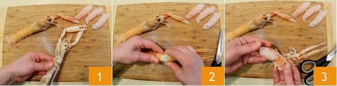 To prepare the lasagna with scampi, cherry tomatoes, and fava bean pesto, start by cleaning the scampi: the shells will be used for the stock, while the scampi are for the filling. Use scissors to cut along the back of the scampi 1, gently detach the head 2, and shell them 3.