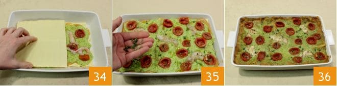 Then continue repeating the layers: first the scampi cream, then the lasagna layer 34, the fava bean pesto, the scampi, and the cherry tomatoes, until you finish the ingredients. Sprinkle the surface with chopped thyme and oregano 35. Cook the lasagna in a preheated static oven at 390°F for about 20 minutes (350°F for 15 minutes if using a convection oven). Once cooked, leave the lasagna in the off oven for a few minutes to let the sauce set better. Then remove them from the oven 36 and serve them hot!