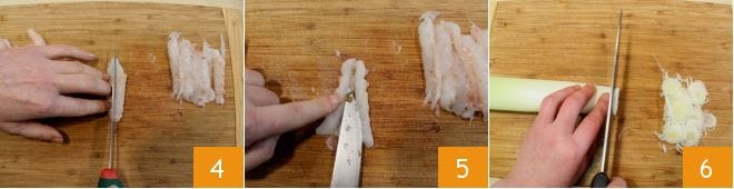 Cut each scampi lengthwise 4 and gently remove the central black thread 5, the scampi's intestine, to discard it. Clean the leek and remove the outer part, then cut it into thin rings 6.