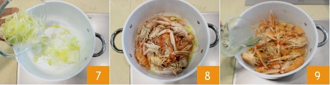 At this point, start preparing the stock: in a pan, pour a drizzle of oil and the peeled garlic clove, halved and deprived of the green sprout; then add the leek 7 and let it wilt over low heat for a few moments, stirring with a wooden spoon. Also add the scampi shells 8, deglaze with the white wine 9, and let it evaporate.
