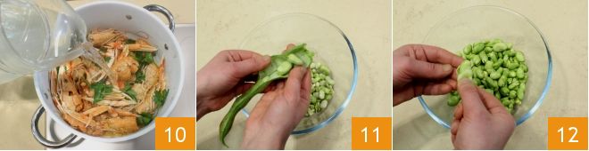 Now add the parsley and water to cover everything 10; let the stock cook for at least 30 minutes over low heat, covered with a lid: at the end of cooking, the liquid should be reduced by half. In the meantime, prepare the Broad bean pesto (Marò): shell the fava beans by gently opening the pod 11 and also remove the outer skin 12.