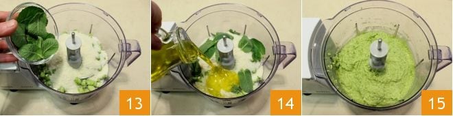 Then pour the fava beans into the mixer along with the cheese and mint leaves 13, then add the oil 14. Blend everything until you obtain a homogeneous mixture 15: store it in a small bowl covered with oil or with cling film in contact while continuing with the preparation.