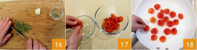 Focus on cooking the confit cherry tomatoes and the scampi: first finely chop the fresh thyme 16, garlic, and take the dried oregano. Separately, cut the cherry tomatoes in half and remove the seeds 17. In a large pan, place the cherry tomatoes side by side with the hollow side facing up 18;