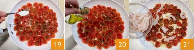 season them with the mixture of oregano, thyme, and garlic, then sprinkle with sugar 19 and salt, finally drizzle the tomatoes with a little oil 20. Turn on the heat to the minimum and let them cook for 10-15 minutes to soften without melting; 3 minutes before turning off the heat, add the shelled scampi 21.