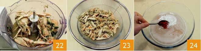 Once the stock is ready, transfer all the contents of the pan (liquid and shells) into the mixer 22 and blend. Then strain everything 23 and collect the liquid in a bowl and dissolve a tablespoon of tomato paste in it 24; you should get about 3 cups of stock that will be used to prepare the béchamel.