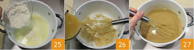 In a pan, pour the butter to melt over low heat, then add the flour gradually 25, stirring with a whisk to create the roux. When the mixture is well browned and the roux has turned an amber color, add the scampi stock in a stream 26, continuing to stir with a whisk and let it thicken over moderate heat until it becomes creamy like a light béchamel 27.