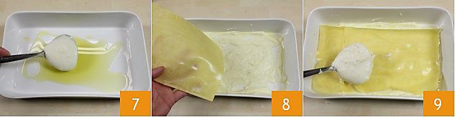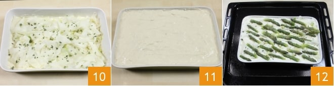Move on to assembling the asparagus and raspadura lasagna: place 3 tablespoons of oil and a layer of bechamel on the bottom of an 18x28 cm (7x11 inch) baking dish or pan 7, then lay down the first layer of egg lasagna sheets 8. Cover the lasagna with a layer of asparagus and a layer of bechamel 9.