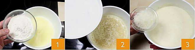 To prepare asparagus and raspadura lasagna, first Béchamel sauce; melt the butter and sift the flour slowly to create the roux 1, stirring with a whisk. Add the slightly warm milk and stir until it thickens 2; add salt and season with nutmeg. At the end of the preparation, off the heat, incorporate the pecorino cheese and mix well 3.