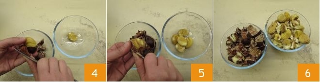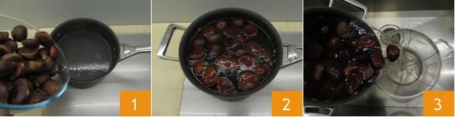 To prepare the leek and chestnut cream, start with the chestnuts. Wash them, dry them, and then put them in a pot full of cold water 1, bring them to a boil 2. Cook for 10 minutes and then drain them 3.
