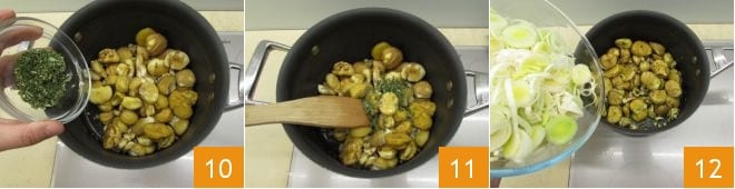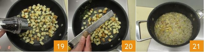 a dash of pepper 19 and nutmeg 20. Sauté for a few moments over high heat so that they absorb the flavors and toast a little; then set them aside. As soon as the chestnut and leek mixture is cooked 21,