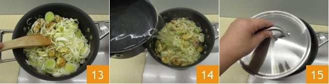 stir again 13 and cook for another 6-7 minutes, so the leek softens well. In the meantime, pour the water into a pot and heat it. Then pour it over the mixture 14, cover with a lid and let it cook on low heat for about 40 minutes 15.