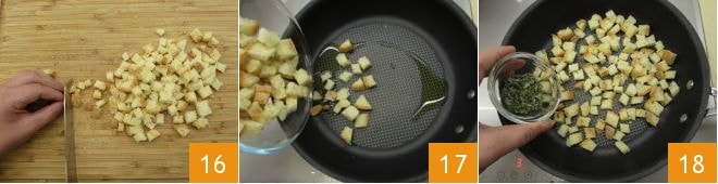 In the meantime, deal with the bread, cut it into cubes of about 1 inch using a serrated knife 16 and then toast it in a preheated pan with a little oil 17, season with the remaining aromatic mixture 18,
