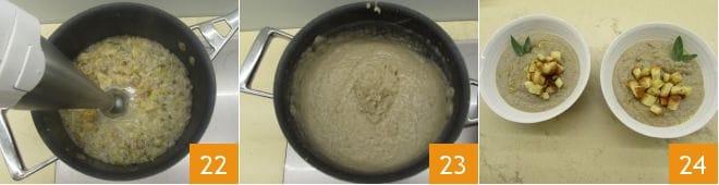 blend it while it is still hot 22: adjust the consistency by adding a bit more water if needed 23. Pour the leek and chestnut cream into plates, garnish with the bread cubes, a couple of sage leaves, a drizzle of raw oil and enjoy 24!