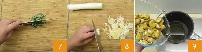 Then chop the rosemary and sage leaves 7 and put them in a bowl; clean the leek by removing the two ends and the outer leaves, then slice it thinly 8. Move to the stove. Put a large pot over the heat and pour in a swirl of oil. As soon as it is heated, add the chestnuts 9.