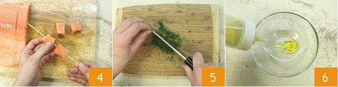 Form 4 skewers by skewering 4 salmon cubes on each stick 4 and place them in a baking dish. Now prepare the emulsion with which you will marinate the salmon skewers: finely chop 2 sprigs of dill 5 and pour the extra virgin olive oil into a bowl 6.