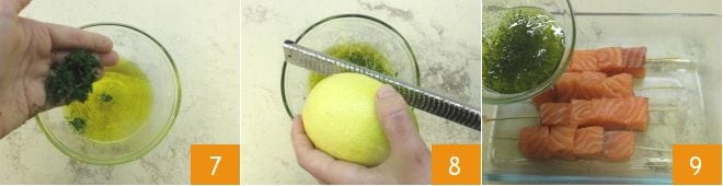 Pour the chopped dill into the bowl with the oil 7 and add the grated zest of an organic or untreated lemon 8, then drizzle the skewers with the dill and oil emulsion 9. The lemon zest, as opposed to the juice, will flavor the salmon without cooking it.