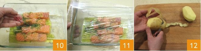 Enrich the emulsion with a tablespoon of pink peppercorns 10 and a pinch of salt. Cover the baking dish with plastic wrap 11 and let the salmon skewers marinate in the fridge for 20 minutes. Meanwhile, start preparing the cream: peel the potatoes 12.