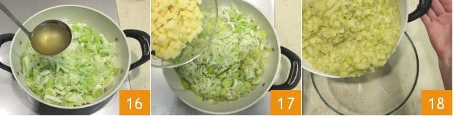 Deglaze with a ladle of vegetable broth 16. To find out how to prepare it best, check out our Cooking School: vegetable broth. Let the vegetable broth evaporate, then add the diced potatoes 17, stir, season with salt and pepper to taste. Cover with the remaining broth, cover with a lid, and cook for 30 minutes until the potatoes have softened. After this time, transfer everything to a bowl 18.