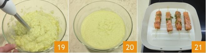 Blend the mixture with an immersion blender 19 until you achieve a creamy consistency 20. If the cream is too thick, add a ladle of vegetable broth. Once the 20 minutes have passed, take the marinated salmon skewers out of the fridge and heat a grill or a large pan. Then sear the skewers over high heat to color the outside and keep the inside soft and juicy 21. It only takes a few seconds per side, and once cooked, remove them from the grill or pan to prevent further cooking. Keep the emulsion as you will need it to further flavor the skewers during or after cooking.