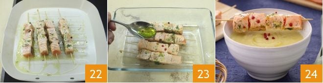 When the meat is slightly pink 22, you can turn off the heat and drizzle them with the same emulsion in which they marinated 23. At this point, all you have to do is pour the leek and potato cream into bowls and accompany each bowl with a salmon skewer 24!