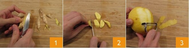 To prepare the lemon and ginger water cake, start by peeling the ginger 1. Then cut it into pieces 2 and proceed to peel the lemon with a vegetable peeler, obtaining the zest 3.