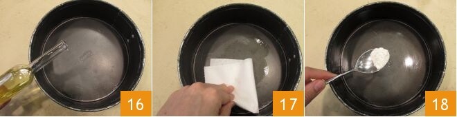 Grease a 9-inch diameter pan using vegetable oil 16 and spread it evenly over the entire surface of the pan, using a piece of kitchen paper 17. At this point, flour it, using a tablespoon of flour 18 and turning the pan upside down to remove the excess.
