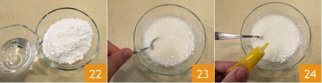 While the cake cools, prepare the glaze: put the powdered sugar in a small bowl and add the water 22. Mix well until a smooth mixture without lumps is obtained 23 and add half a teaspoon of yellow gel food coloring 24.