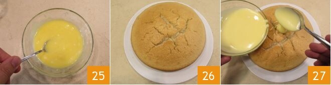 Mix well to incorporate the coloring 25 and then unmold the cake, placing it on a plate 26. At this point, you can proceed with glazing: pour the glaze over the cake 27