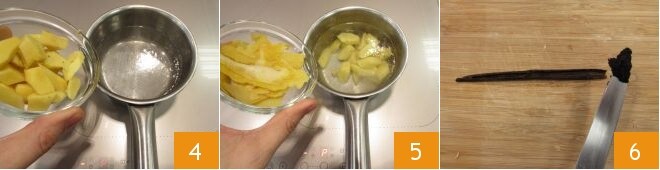 Pour the water into a saucepan and bring it to a boil: at that point, add the ginger pieces 4 and the lemon zest 5. Let it boil for 10 minutes, then remove the saucepan from the heat. Split a vanilla bean lengthwise and scrape out the seeds with a knife 6.