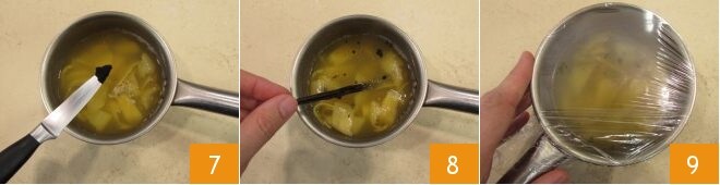 Remove the saucepan from the heat and add the vanilla seeds 7. Add the pod as well 8, then cover the saucepan with plastic wrap 9 and let everything steep for at least 2 hours (or even overnight).