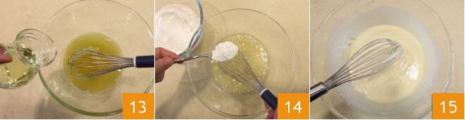 Add the vegetable oil 13, still mixing well. Sift the flour with the baking powder and add the dry ingredients, one spoonful at a time, to the water, sugar, and oil emulsion 14, mixing well to prevent lumps. Continue until all the flour is incorporated 15.