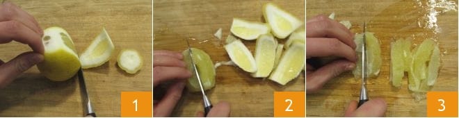 To prepare the lemon cake, first peel the lemons: remove the peel with a smooth-edged knife, making sure to also remove the more bitter white part 1, then cut the whole pulp in half 2 and drag the knife over the cutting board to separate the pulp from the white membranes 3: you will need a total of 170 g of lemon pulp.
