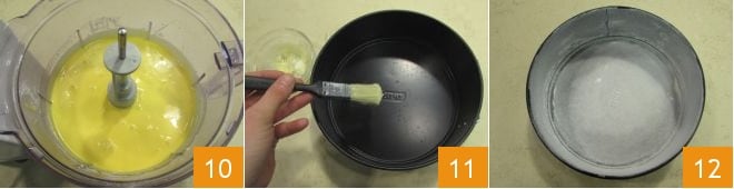 then blend everything until you obtain a smooth and uniform mixture 10. Now take a 7.87-inch springform pan and butter it carefully 11, then flour it 12.
