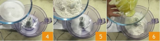 Preheat the oven to 350°F in static mode, and combine all the ingredients in a mixer with blades: add the instant baking powder, sugar 4, flour 5, and lemon pulp 6.
