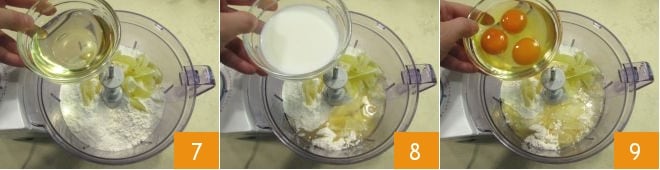 Also add the vegetable oil 7, whole milk 8, and whole eggs 9,