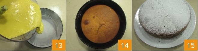 Pour the batter inside 13 and bake in the preheated static oven at 350°F for about 60 minutes, placing it on the lower rack. Once baked (always perform the toothpick test at the end of cooking), remove the cake from the oven and let it cool in the mold 14, then unmold it and dust it with powdered sugar. Your fragrant lemon cake is ready to be enjoyed 15!