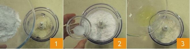 To prepare the lemon truffles, pour the almond flour into a mixer equipped with steel blades, add the powdered sugar 1 and salt 2, and blend for a few seconds. Now add the egg white 3,
