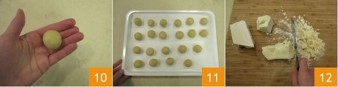 After the cooling time has elapsed, take the mixture and form balls of about 15 g each, shaping them with your hands 10. Place the balls on a tray lined with parchment paper 11 and let them cool in the refrigerator for another hour. Towards the end of the cooling time, proceed to temper the white chocolate: finely chop the chocolate with a knife 12