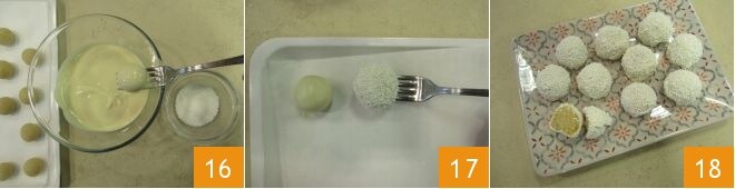 At this point, take the truffles from the refrigerator and dip them one at a time in the melted chocolate 16, then cover them evenly with sugar sprinkles and place them on a tray lined with parchment paper 17. Let them crystallize at room temperature for about 15 minutes, after which your delicious lemon truffles will be ready to be enjoyed 18!