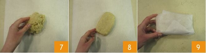 Transfer the mixture onto a sheet of parchment paper 7, shape it slightly with your hands to form a loaf 8, then wrap it in parchment paper 9 and place it in the refrigerator to rest for at least an hour.
