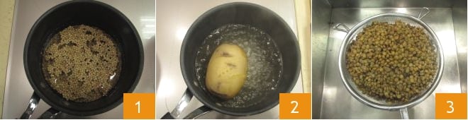 To make the lentil rosti with monkfish, first prepare the rosti mixture: pour the lentils into a pot and cover with water, turn on the heat and cook for about 20 minutes 1, ensuring the lentils do not break apart but remain somewhat crunchy. Place the potato in another pot of water and boil until soft 2. Once cooked, drain the lentils and set them aside 3.