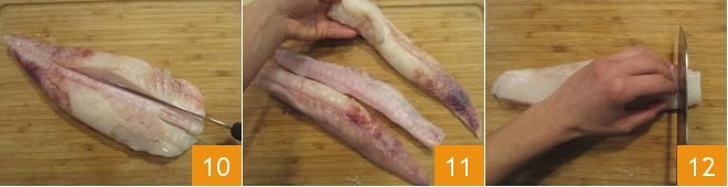 Take the monkfish and divide it lengthwise, cutting along the central spine 10 to obtain 2 fillets 11. From each fillet, cut medallions about 1 inch thick (the diameter varies depending on the size of the fillet) 12